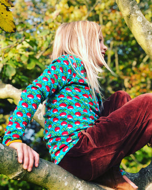 Prachtige helder turquoise longsleeve vol vrolijke radijsjes. Met mosterd gele bies