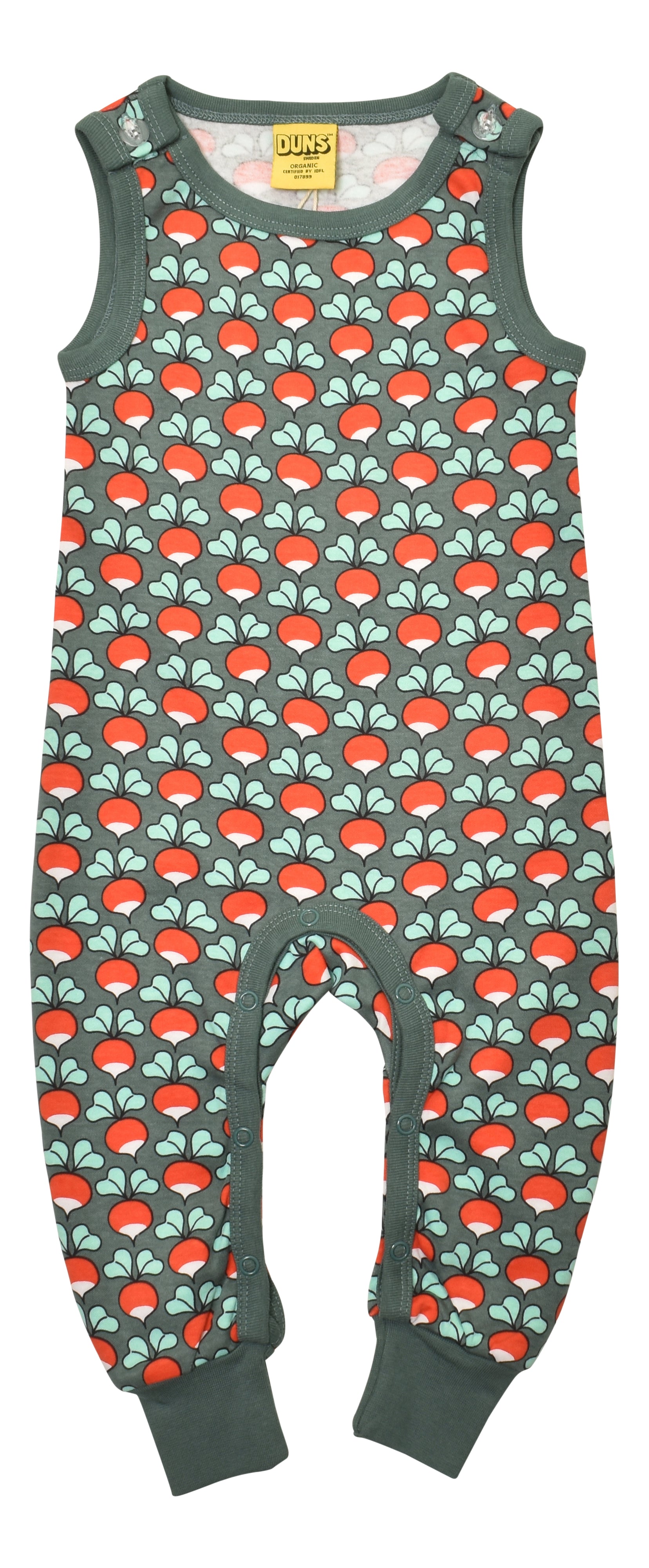 Heerlijke zacht pak zonder mouwen (leuk met effen bijpassende romper eronder) van 100% biologisch GOTS gecertificeerd katoen van het Zweedse kinderkleding merk Duns Sweden. T/m maat 74 drukknoopjes tussen de benen voor gemakkelijk verschonen. Vanaf 80 niet meer.
