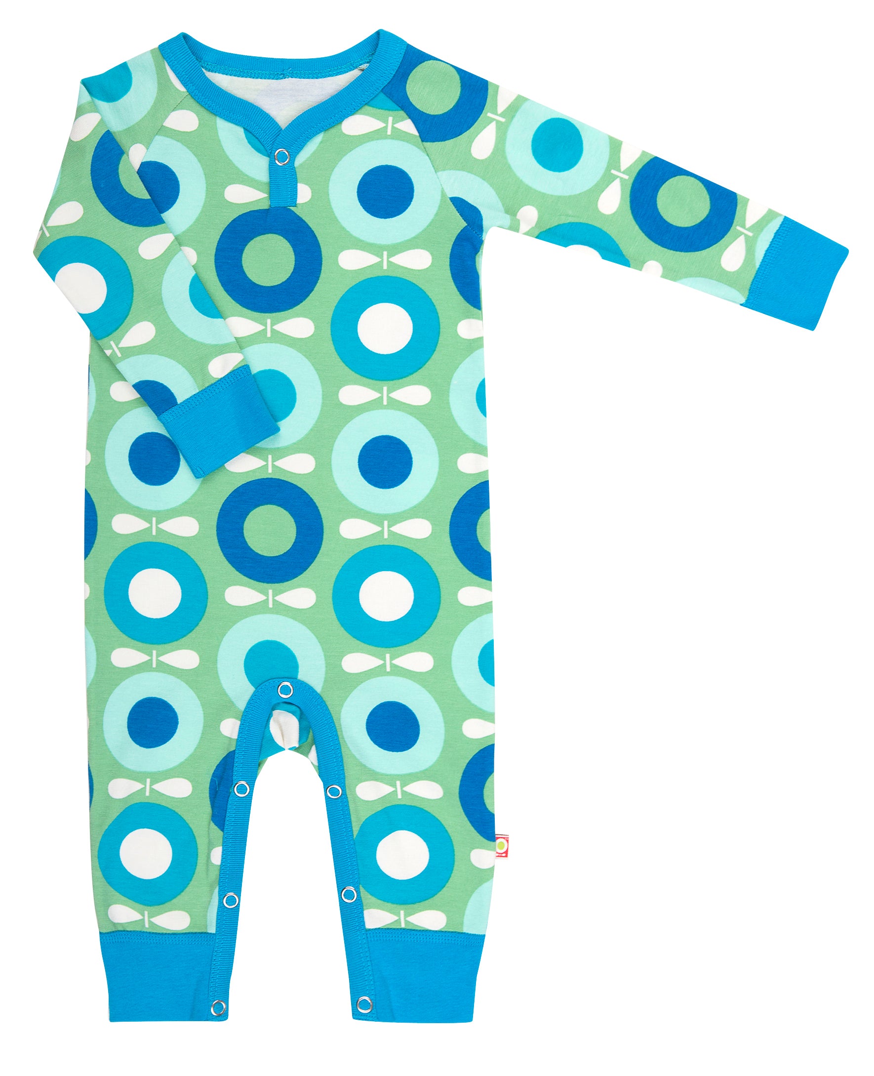 Lovely suit by Katvig in Big Apples print full of cheerful apples in blue tones on a soft green background. Or are they flowers? Made of GOTS certified organic cotton with a touch of elastane. The suit has fine blue cuffs on sleeves and legs, press studs between the legs and a cute blue press stud at the neck.