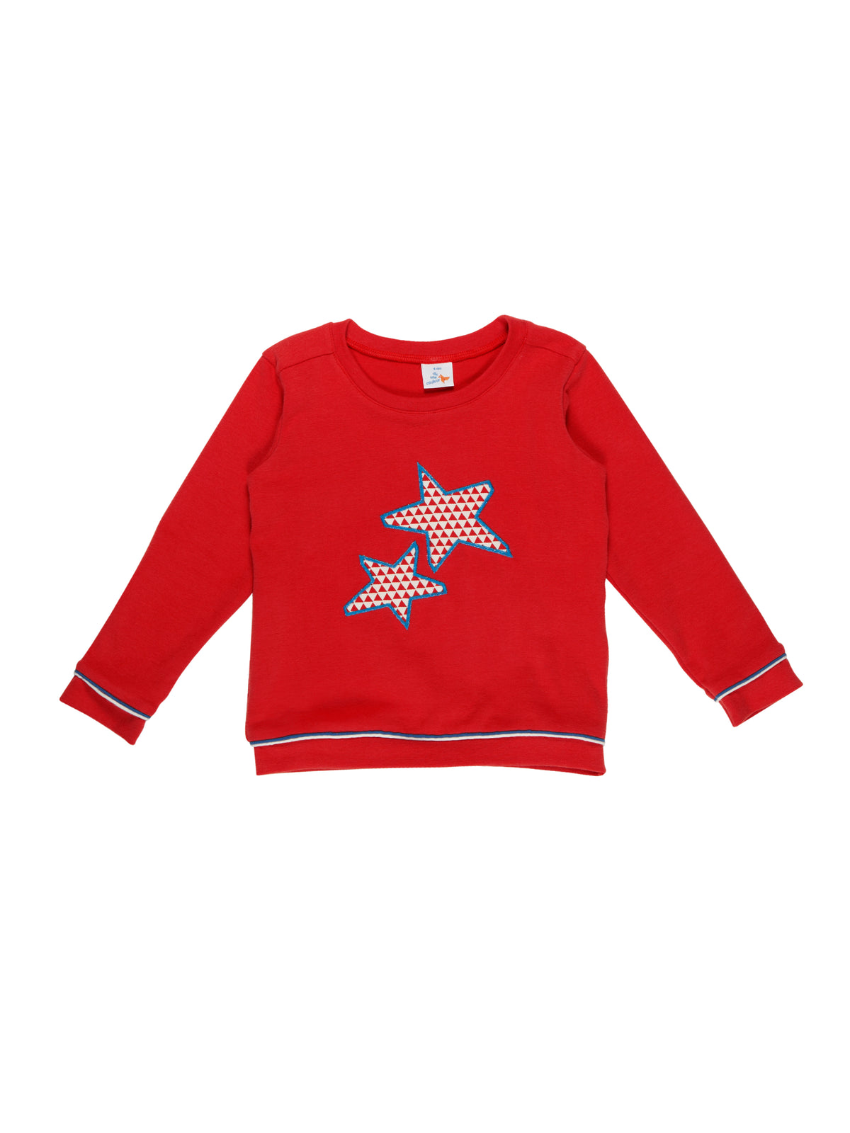 Dis une Couleur의 긴팔 스웨터는 빨간색 별 무늬가 특징이며, 파란색 스티칭이 들어간 빨간색/흰색 별 무늬가 디자인되어 있습니다. 바닥 가장자리와 소매를 따라 멋진 파란색 파이핑이 있습니다. 엘라스테인이 첨가된 유기농 코튼으로 만들었습니다. 참고사항: 작은 사이즈에 맞습니다! 1~2사이즈 큰 것을 선택하세요.