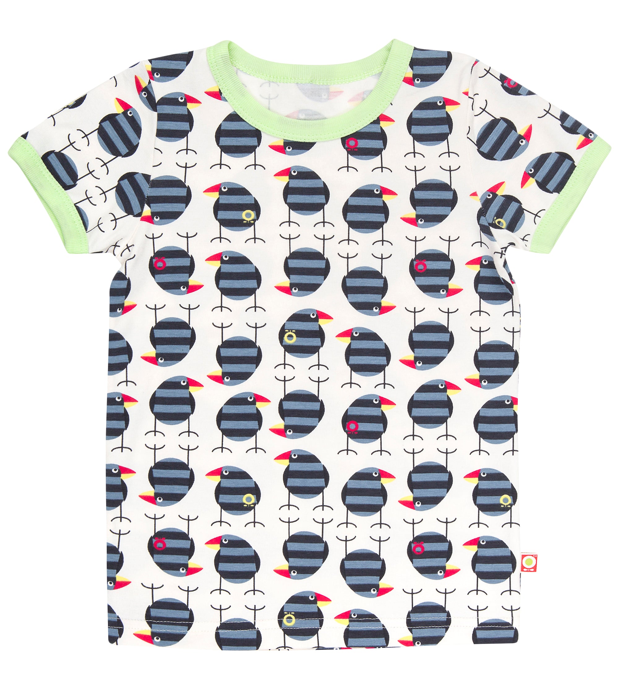 크림색 흰색 배경에 빨간색/노란색 부리가 있는 웃긴 검정/회색 줄무늬 새가 그려진 Katvig의 Birdy 프린트 티셔츠입니다. GOTS 인증 유기농 코튼에 라이크라를 첨가한 소재입니다. 티셔츠는 목과 소매를 따라 부드러운 녹색 파이핑이 있습니다.