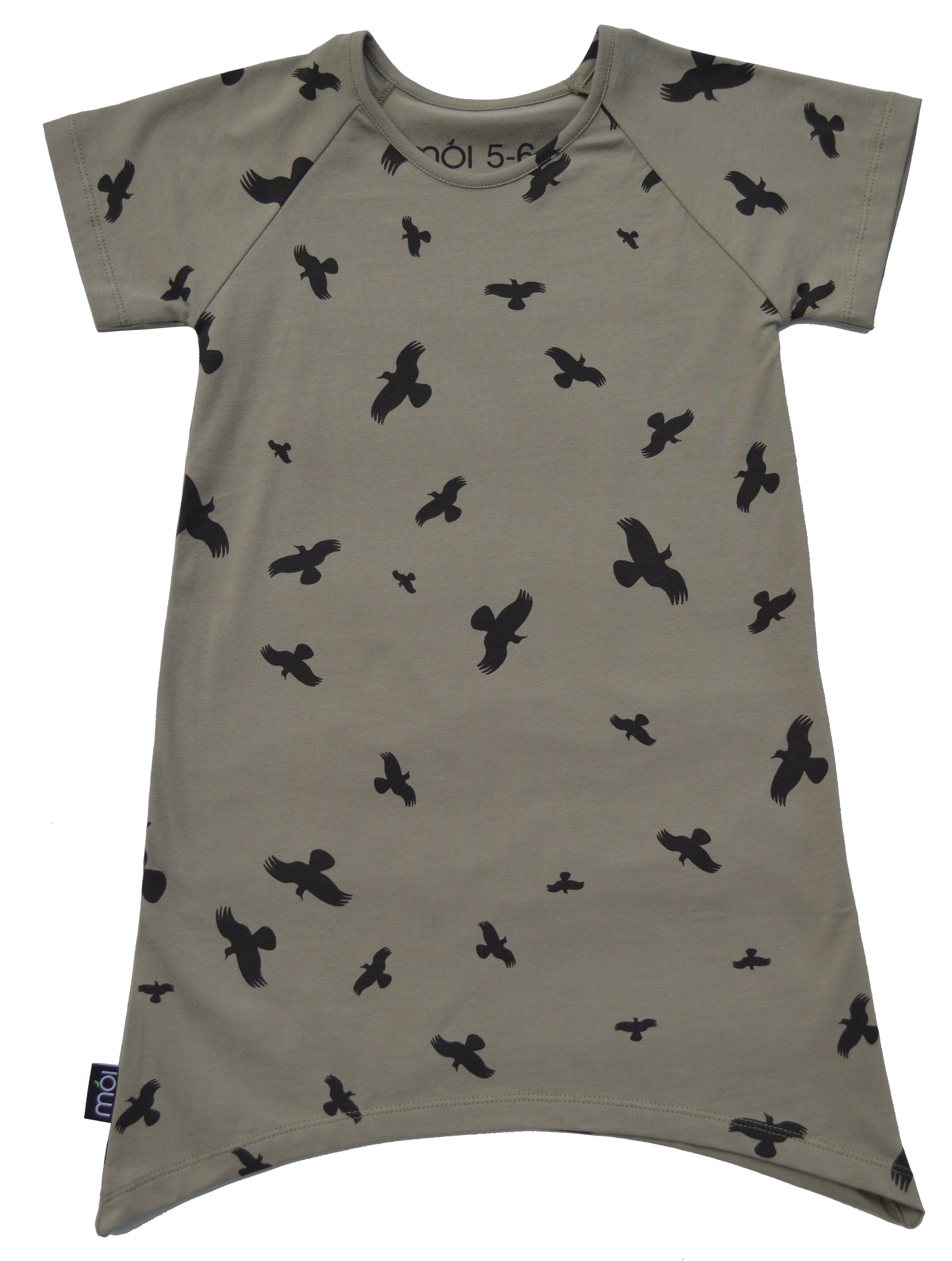 Moi의 반팔 드레스. 95% 유기농 면, 5% 엘라스테인으로 만들어졌으며, 매트 모스 그린 색상에 검은색 새 실루엣이 가득 들어 있습니다. 이 드레스는 밑단이 똑바로 늘어지지 않고 옆으로 뾰족하게 늘어지는 멋진 모델입니다.