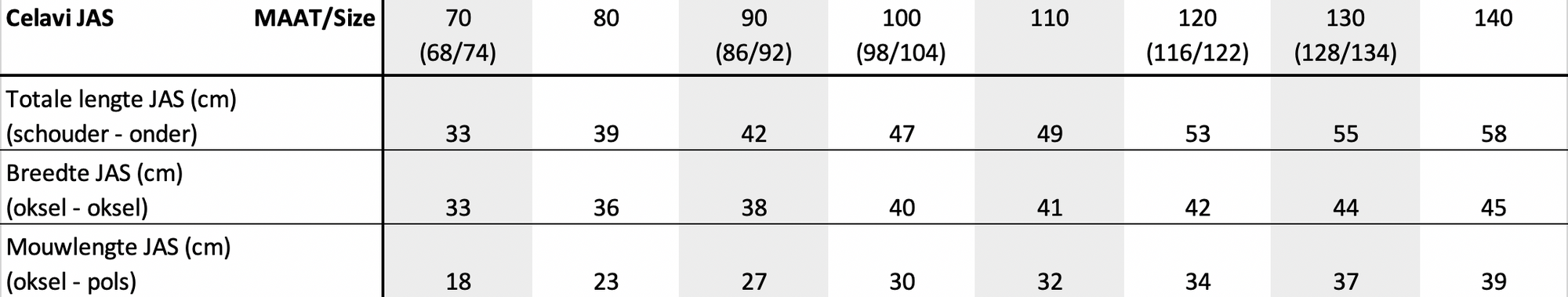 MAATVOERING: Celavi werkt met maten in sprongen van 10cm, die overeenkomen met de lengte van je kind. Maat 100 komt overeen met een lichaamslengte van 100 cm en kan dan nog even doorgedragen worden. Meet je kind op om de juiste maat te bepalen en rond af naar boven. Kies bij 100 cm liever voor maat 110.