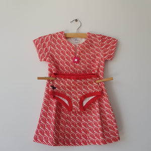 Jurk van Dis une Couleur in all-over wit/rood Diamonds motief met bijpassend onderbroekje. Een echte retro jurk met een dikke knipoog naar de sixties. Ronde hals met grote knoop, mooie belijning. Gemaakt van organic cotton met polyester. Geweldige set! Let op: valt klein! Kies 1 of zelfs 2 maten groter.