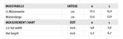 De maten zijn in cm omtrek (maat 0 = 36-40, zo voor de eerste maanden, maat 1 = ongeveer 42-46, rond het half jaar, maar eea is sterk afhankelijk van de hoofdomtrek van je kindje. Meet die dus voor de zekerheid even op. Een te grote muts die niet fijn aansluit is niet fijn.