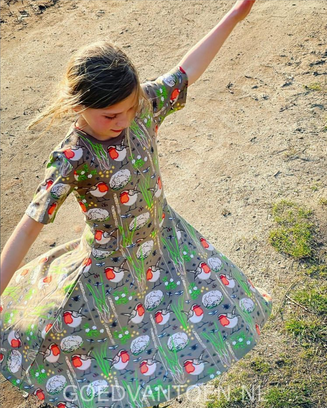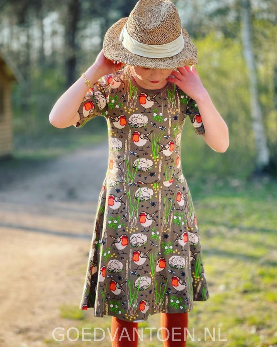 (foto's van de jurk met roodborstjes als voorbeeld om het model van de jurk te laten zien)