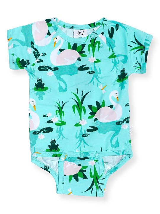 Heerlijk korte mouwen rompertje vol zwanen, lelies en kikkertjes van JNY. Gemaakt van biologisch katoen.
