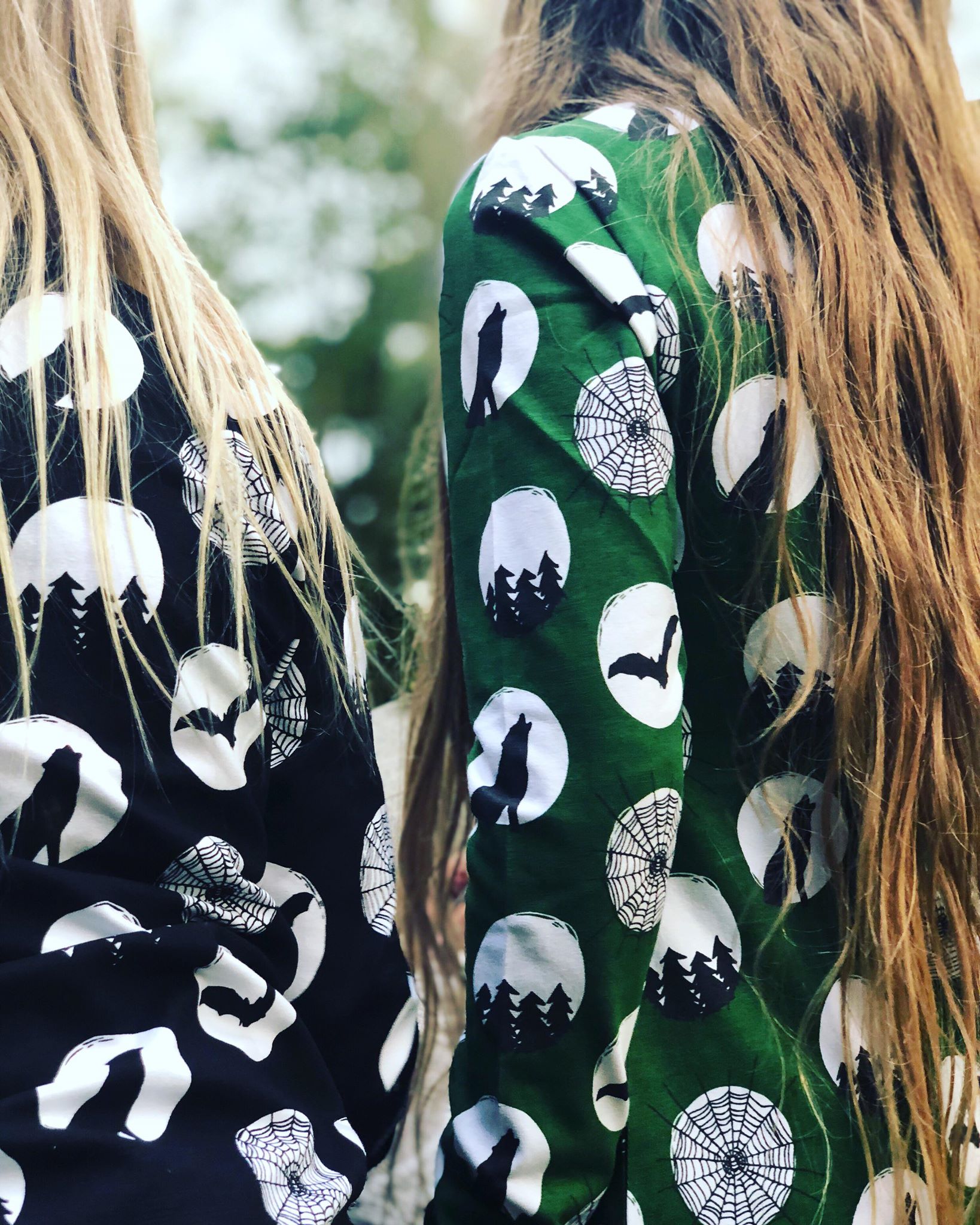 Geweldig leuk jurkje van More Than A Fling vol silhouettes van spinnenwebben, huilende wolven, vleermuizen en dennebossen. De jurk valt ruim als de grootste maat (en kan dan nog even). Op de foto mijn 134 cm lange dochter in de 122/128