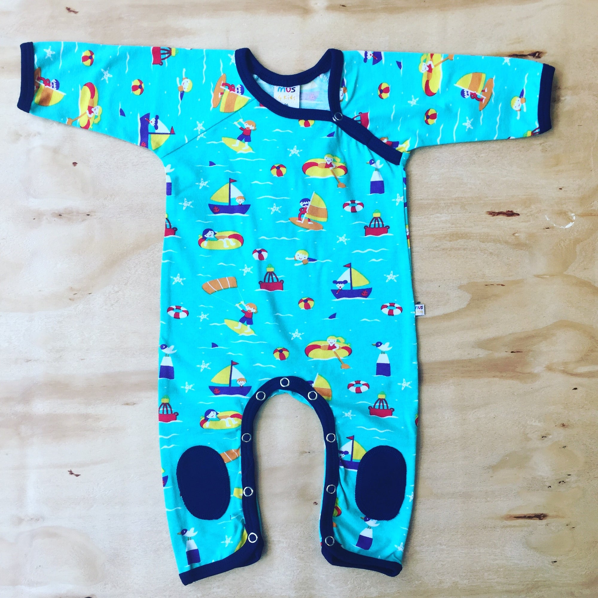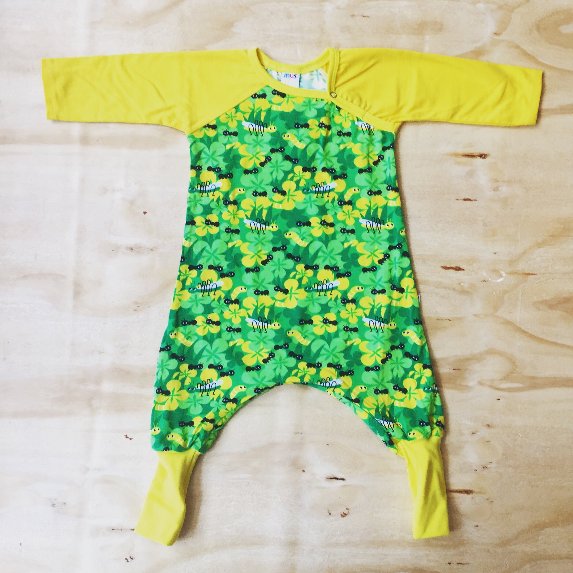 De jumpsuits van Mus4Kids vallen wat kleiner uit. De 'benen' zijn wat langer zodat met name in een draagdoek de onderbeentjes ook goed bedekt blijven.