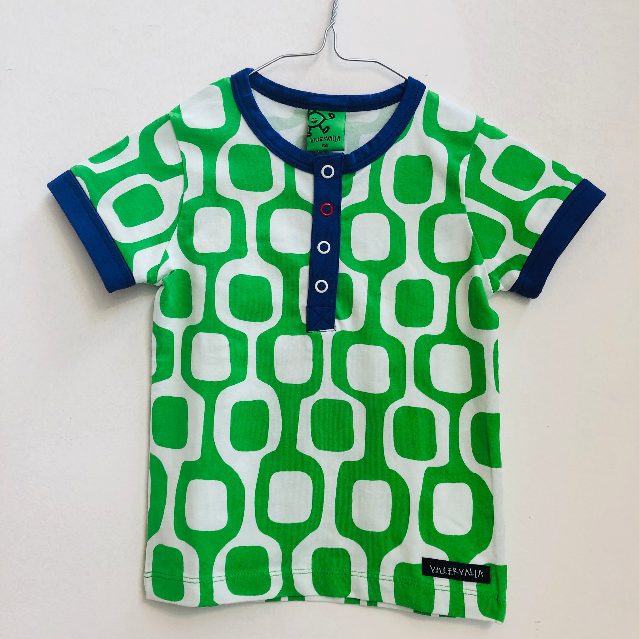 T-shirt met geometrisch patroon in groene kleur. langs hals en op de borst een paars biesje met knoopjes waarvan 1 rood.