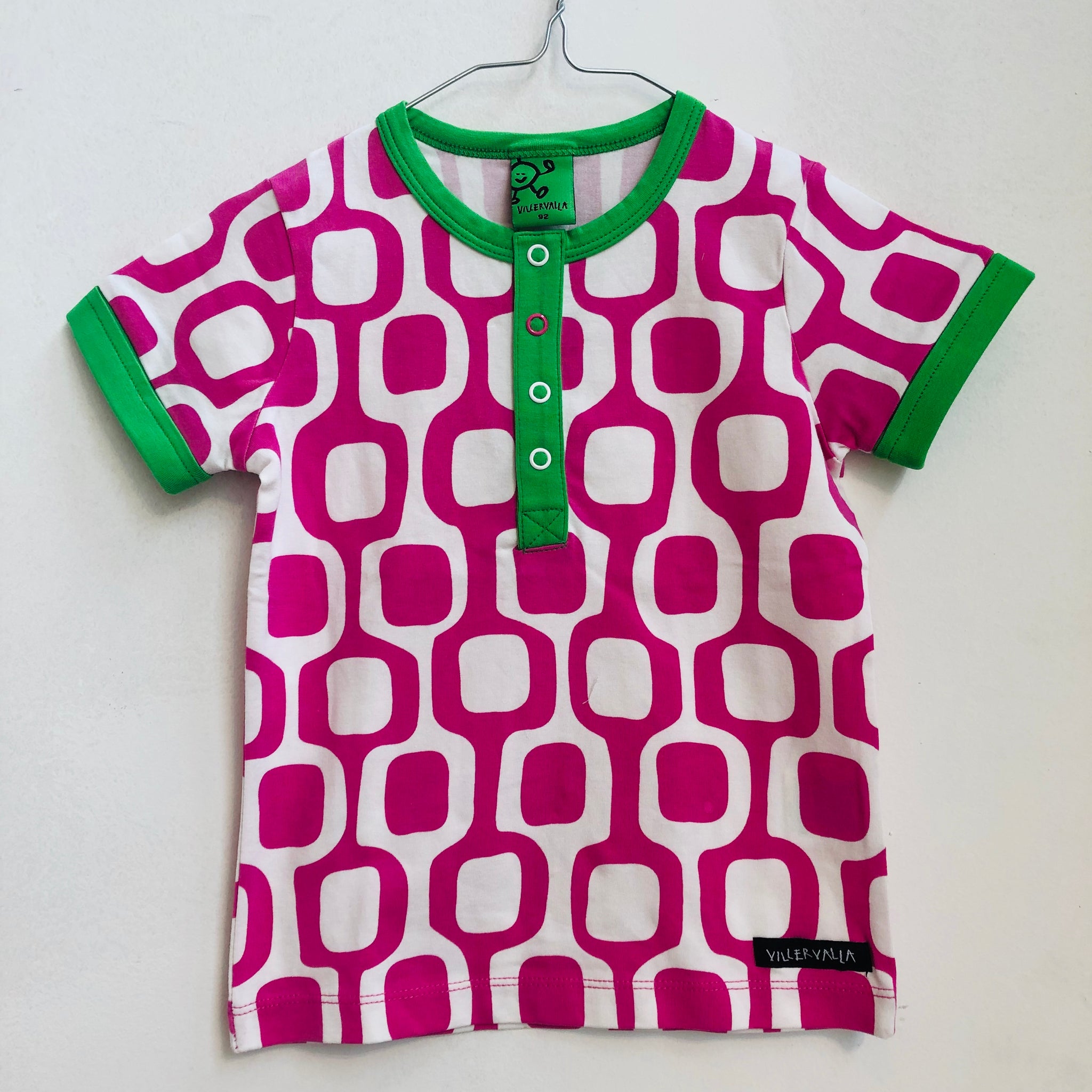 T-shirt met geometrisch patroon in roze kleur. langs hals en op de borst een groen biesje met knoopjes.